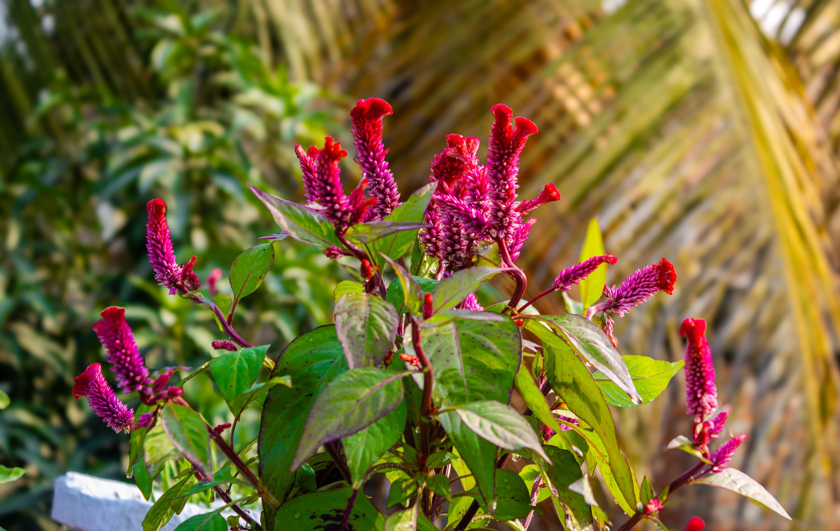 In a sunlit garden where dreams unfurl, crimson celosia sways in whispered delight, its feathery flames ablaze in nature's embrace, a fiery symphony against emerald leaves and distant, blurred echoes of life.